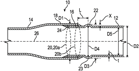 • wherein a contour of the buckle-inducing deformation is curved from a crest of the buckle-inducing deformation to a portion of the main body of the first pipe having the first diameter;